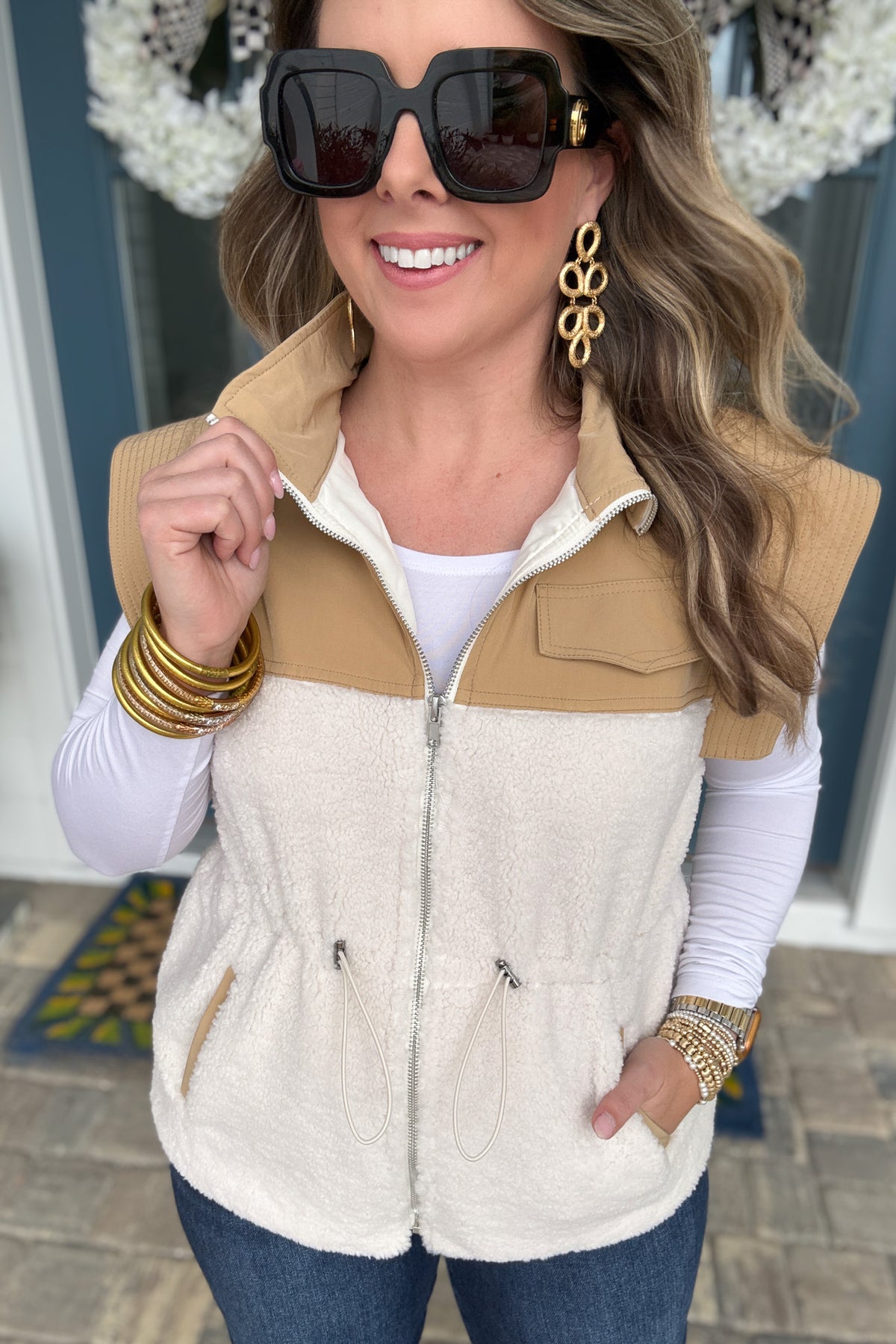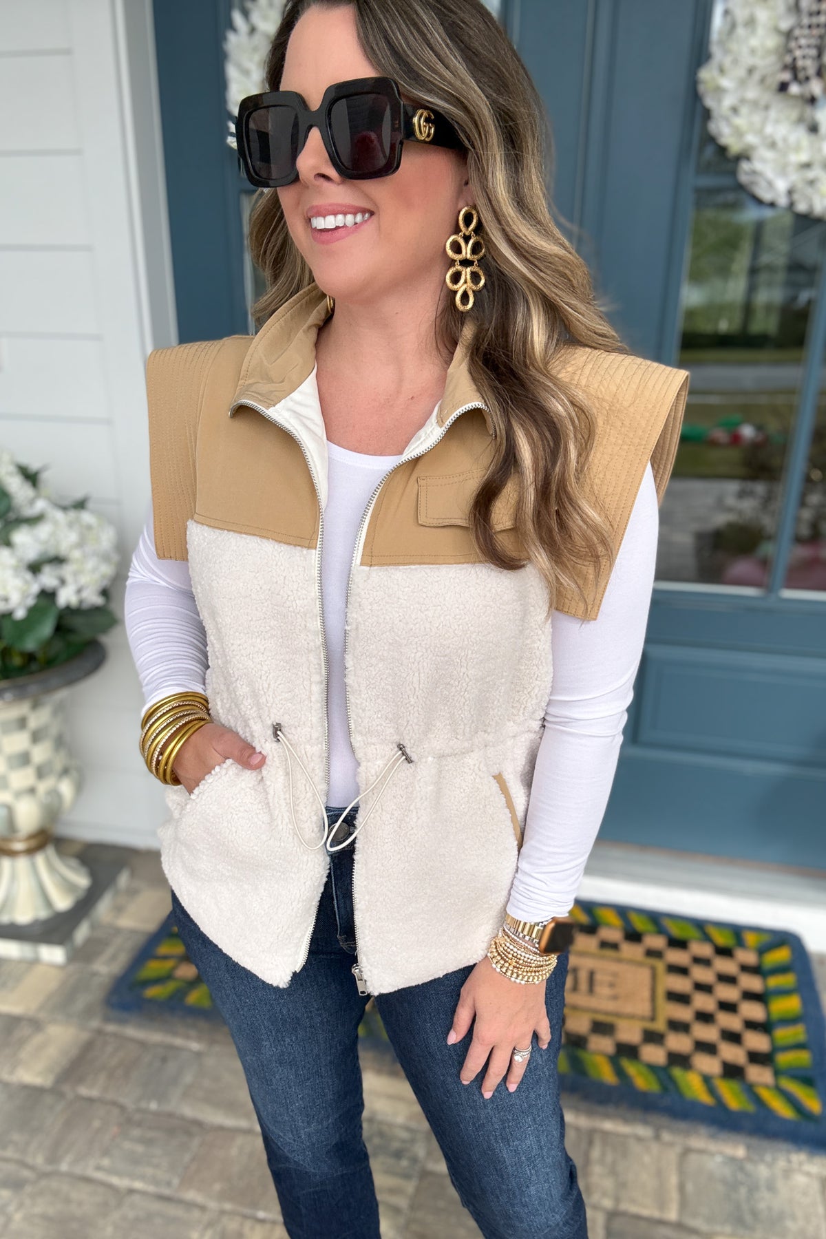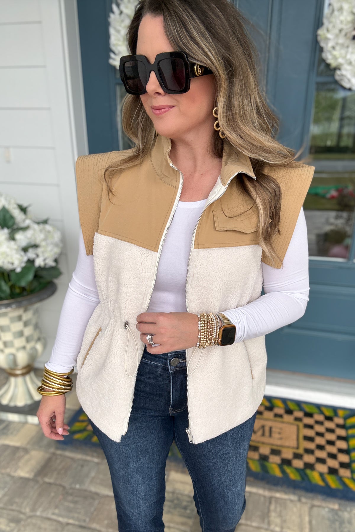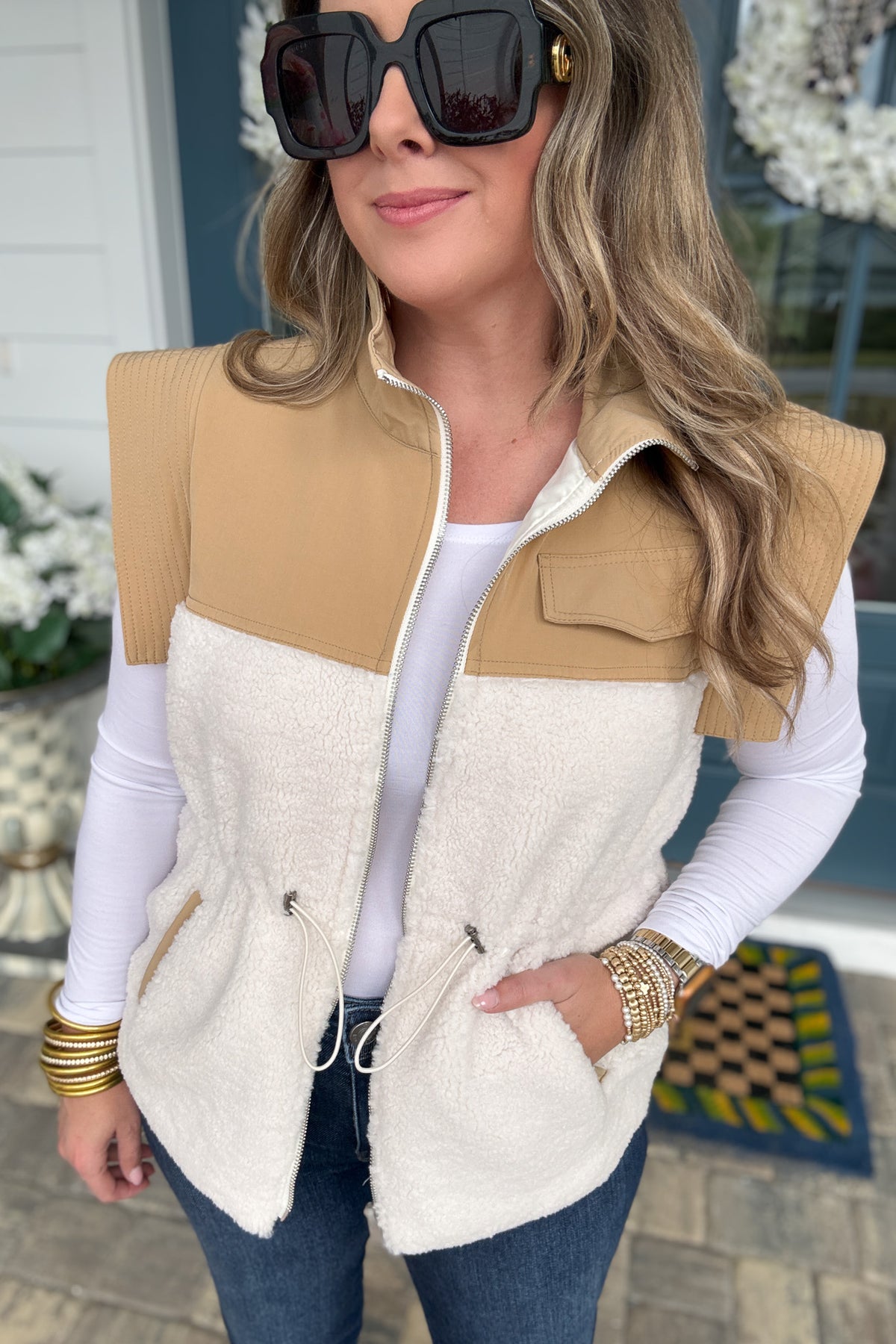 Cozy meets cool. The Aspen Sherpa Utility Vest features ultra-soft sherpa fabric with neutral contrast detailing and a flattering zip-front design. Perfect for layering on chilly mornings while still keeping your outfit polished.