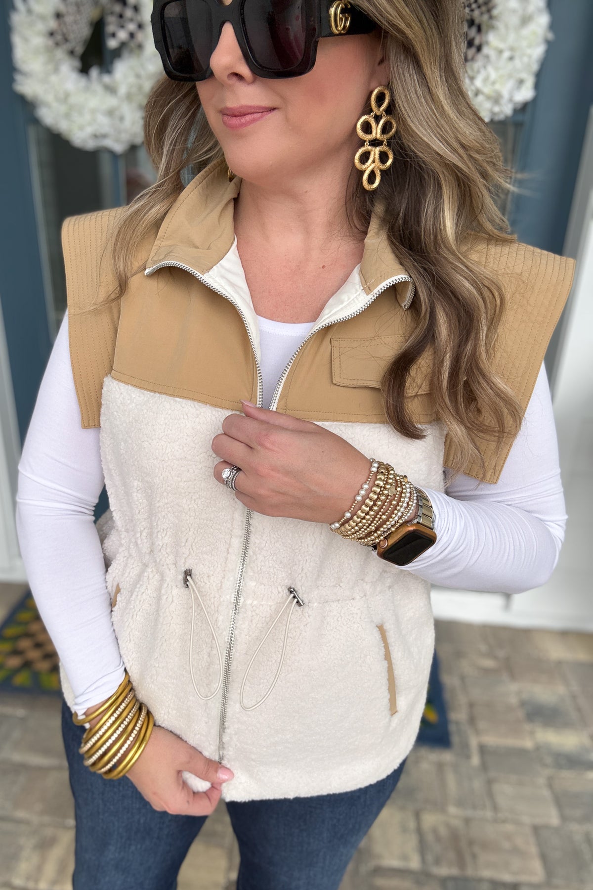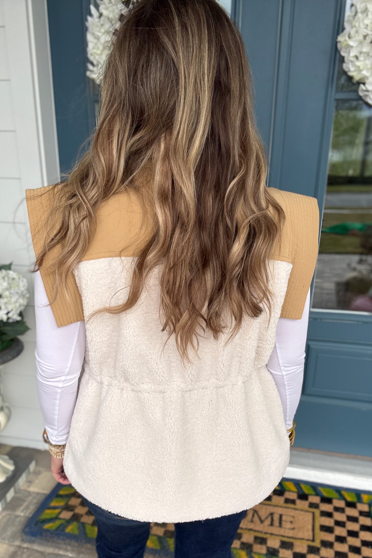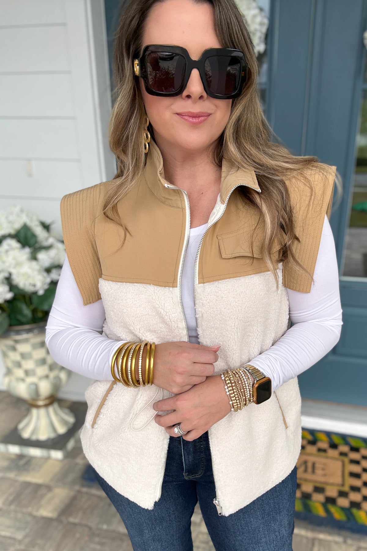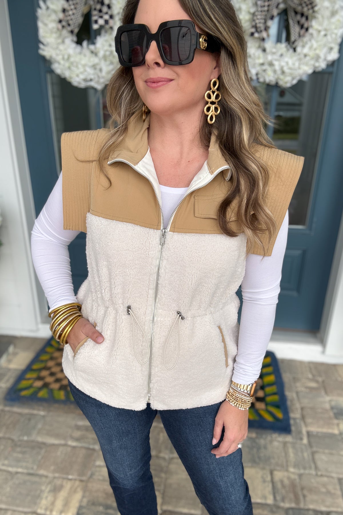 Cozy meets cool. The Aspen Sherpa Utility Vest features ultra-soft sherpa fabric with neutral contrast detailing and a flattering zip-front design. Perfect for layering on chilly mornings while still keeping your outfit polished.