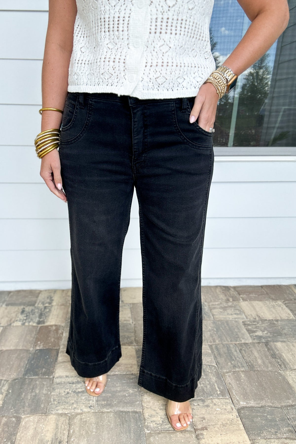 • Designed to flatter, these high-rise wide leg jeans come in a sleek black wash and are made from a soft, stretchy material for ultimate comfort. Featuring Fab Ab pockets, double front pockets, and a wide hem, they offer a modern silhouette with just the right amount of structure and style.
