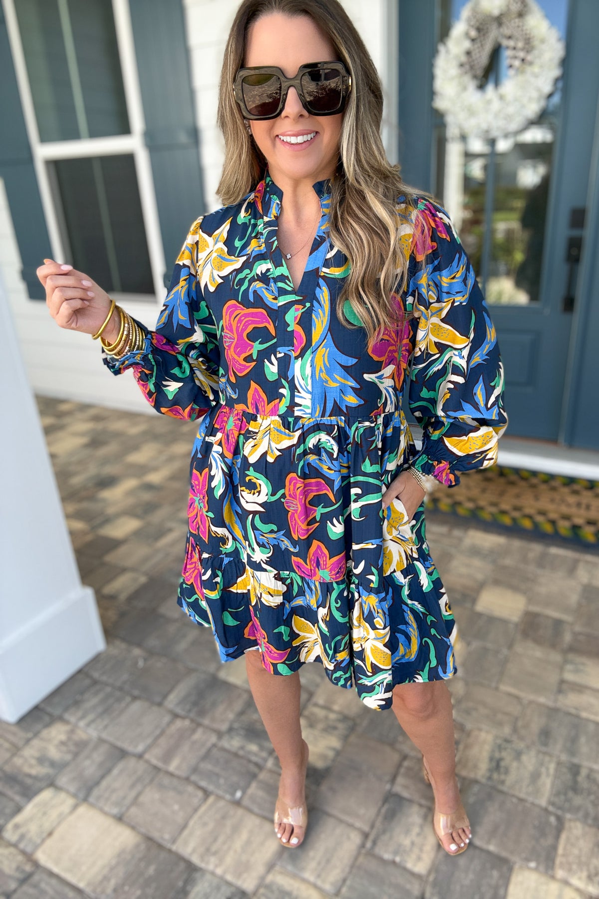 Meet your new statement-maker. This vibrant floral mini dress is bursting with color and confidence, featuring a flattering split neckline, tiered silhouette, and easy long sleeves. Lightweight and breezy, it’s the perfect throw-on-and-go piece for brunch, vacation days, or sunny afternoons when you want to stand out.