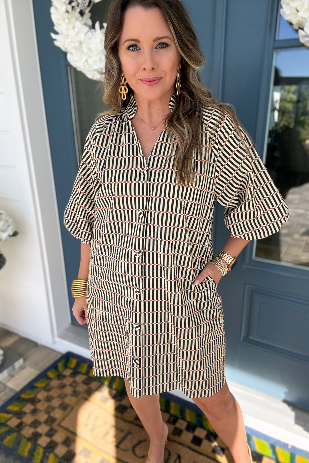 THML: Black + Cream Dotted Puff Sleeve Striped Dress