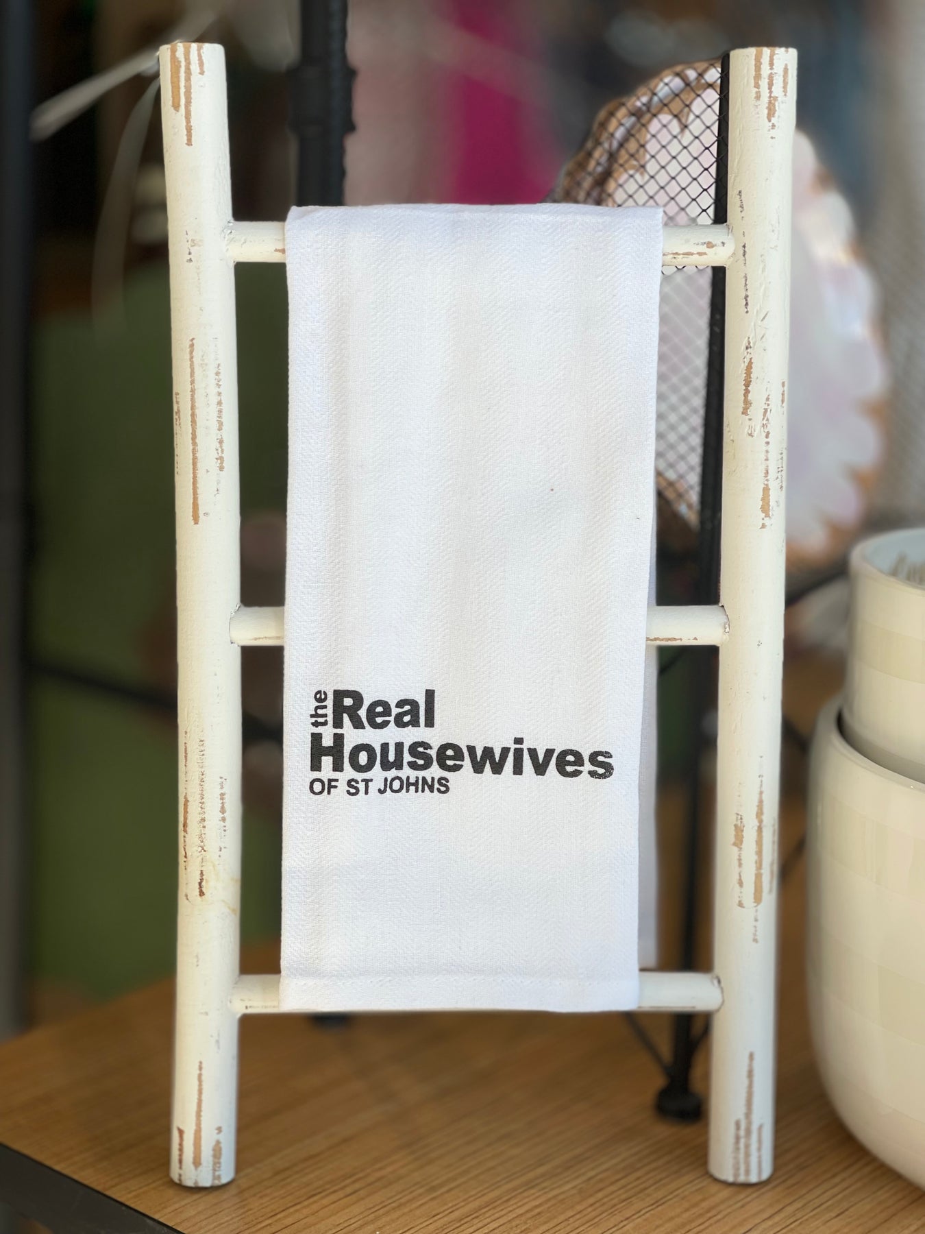The Real Housewives of St Johns!  This crisp dish towel will make you smile and remind you of good times.
