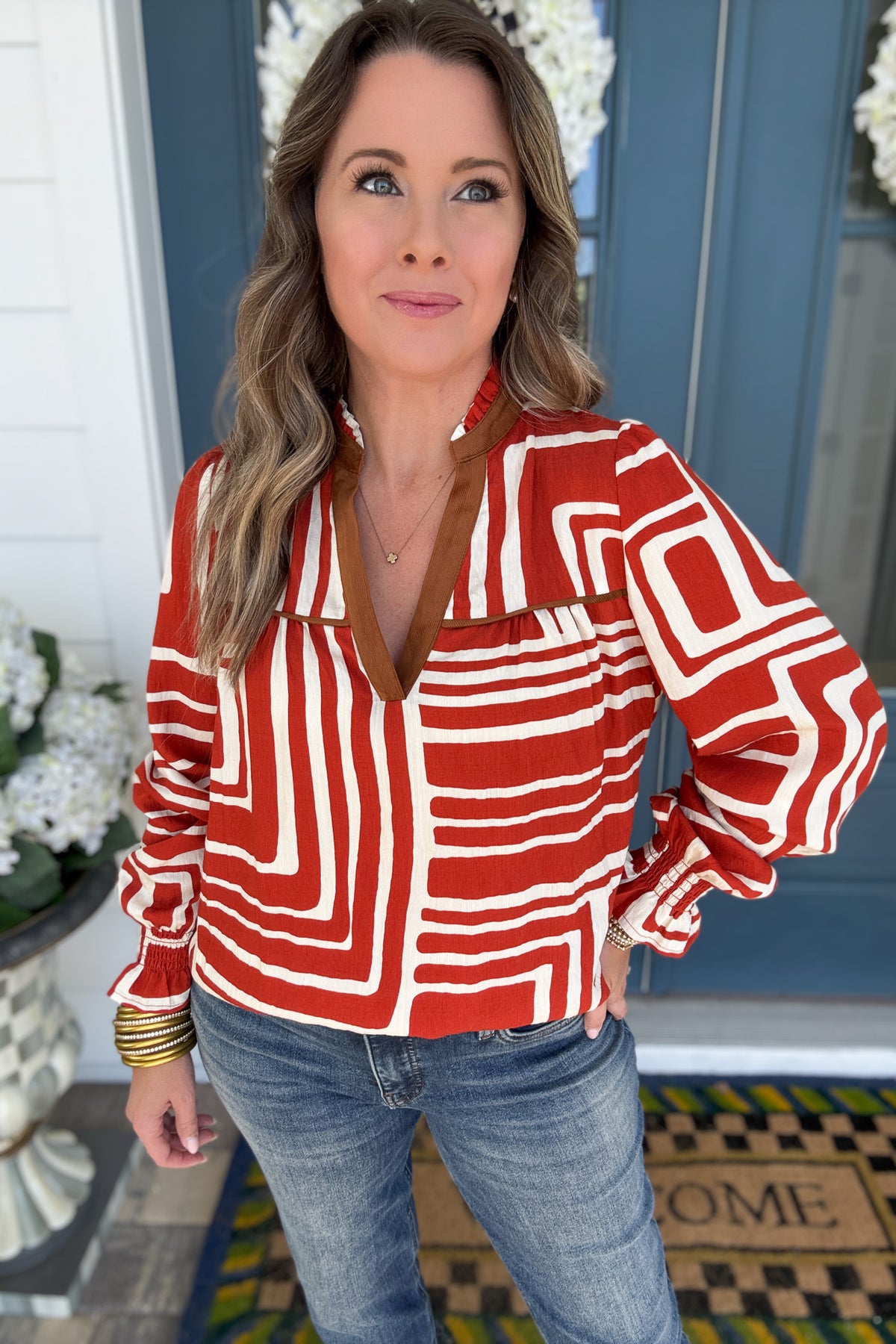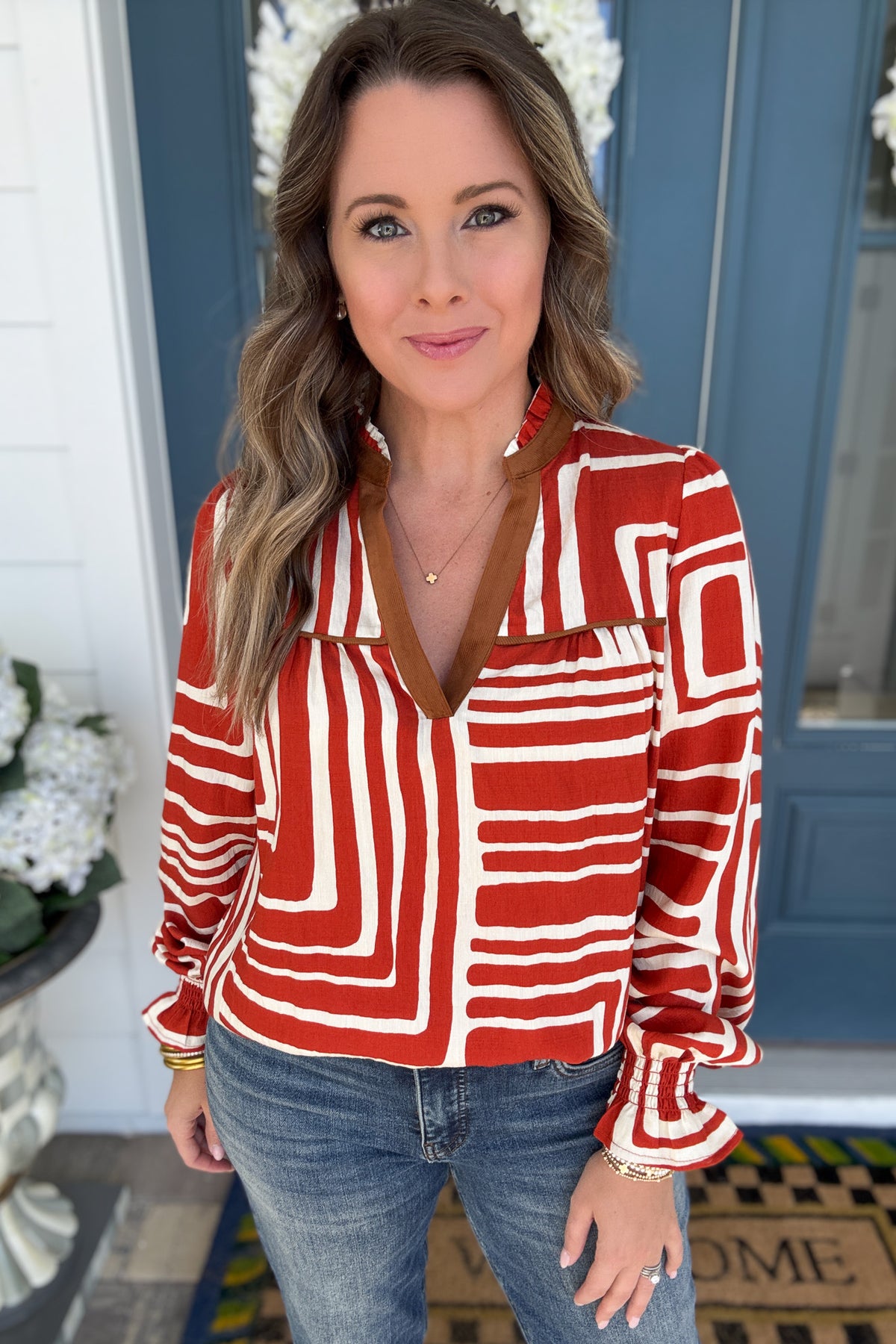 The Harvest Maze Blouse brings artful flair to your fall wardrobe. In a bold rust and cream geometric print with contrast mocha trim, this top transitions seamlessly from office hours to happy hour.