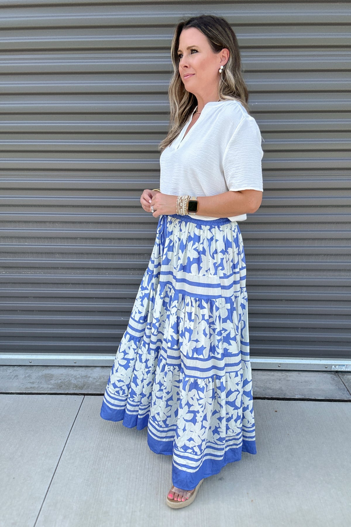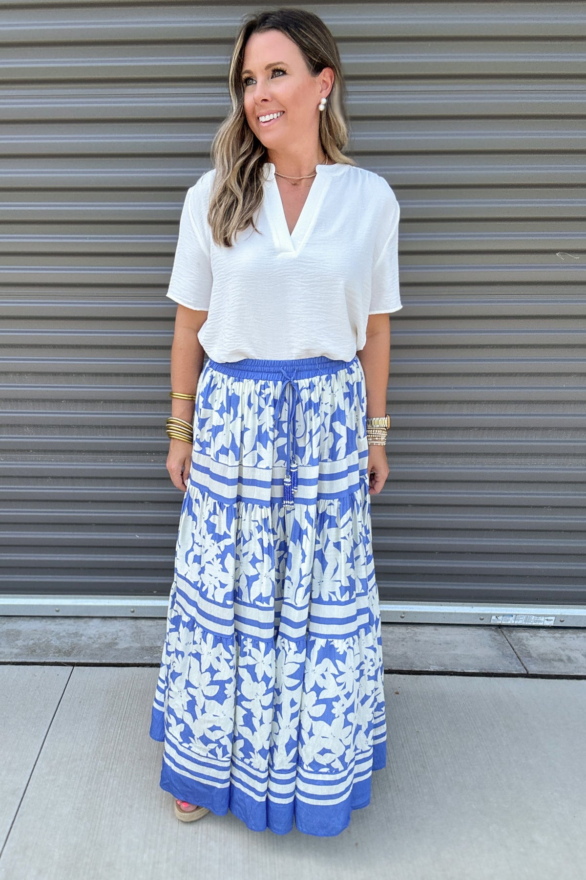 Get ready to escape into style with our Spring Escape Maxi Skirt! This playful blue skirt features a fun printed design and an elastic waist with a tie for the perfect fit. We love the beaded accent on the tie waist! Its flowy silhouette makes it easy to toss on and go, for a look that's both effortless and eye-catching. (Don't miss out on this must-have skirt!)