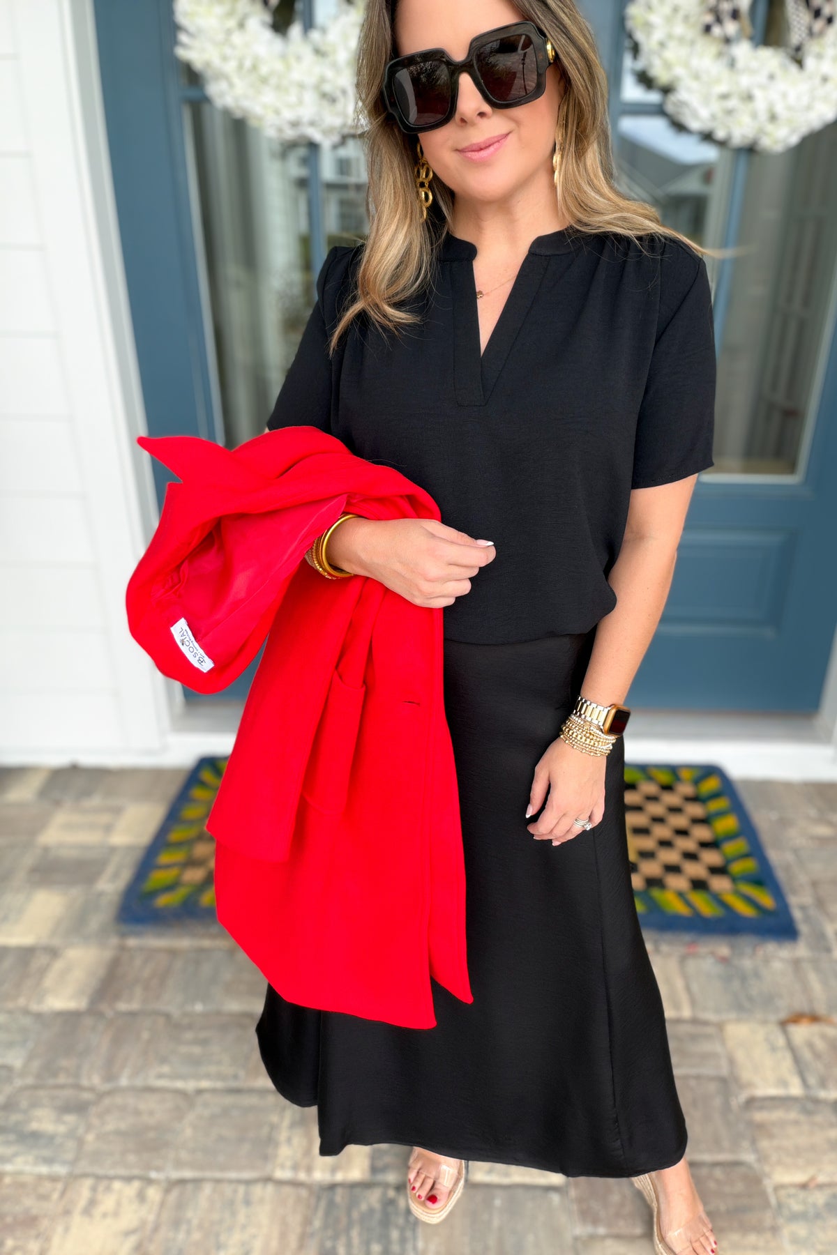 We love this versatile ivory short sleeve blouse. Featuring a loose body, v-neckline with pleating and short sleeves. Wear this blouse to work then to happy hour! Simply tuck this cutie in to elevate your look!