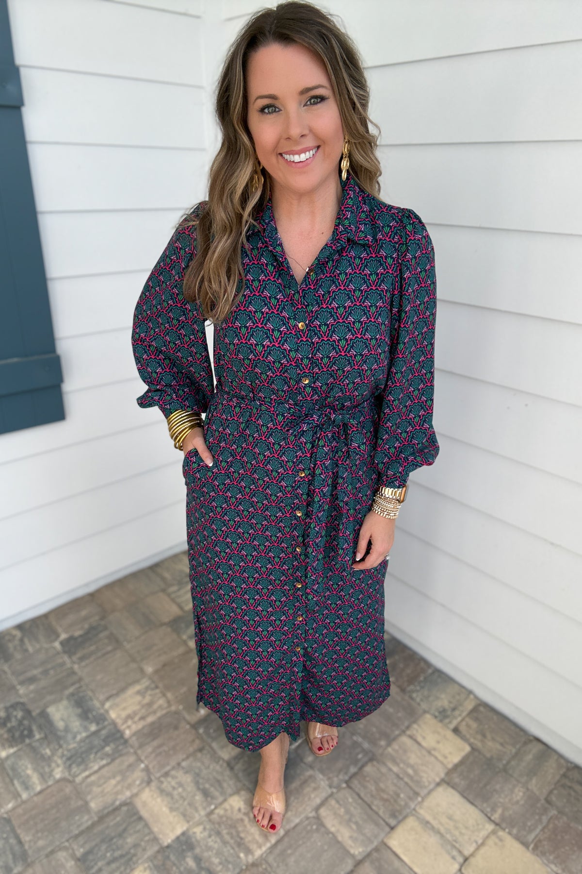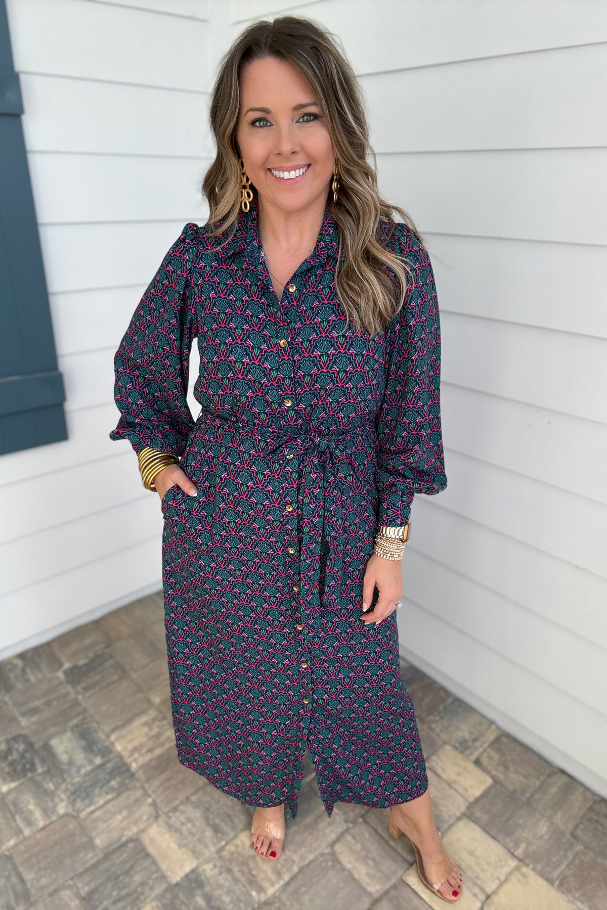 The Ava Dress is the perfect mix of chic and functional. Designed with a removable adjustable belt, you can personalize the fit to your liking, while the long puff sleeves with button cuffs add a touch of elegance and sophistication. Featuring practical side slits at the seam and hidden pockets, this midi-length dress combines style and comfort effortlessly.