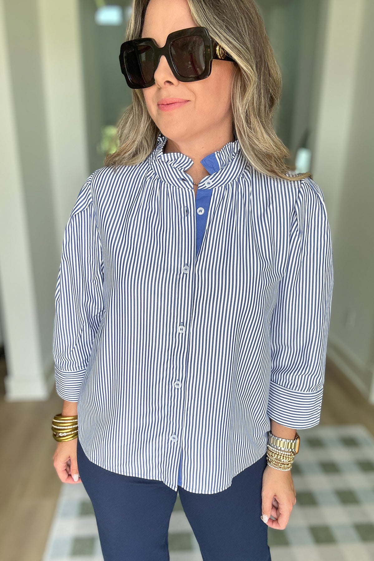 Elevate your look with this playful striped top featuring a stand-up collar trimmed with delicate ruffles. The front button closure adds charm, while the back’s inverted pleats create a flirty flow. Three-quarter tucked sleeves end in slit band cuffs, giving a fun twist to classic style. Perfect for adding a pop of personality to any outfit!