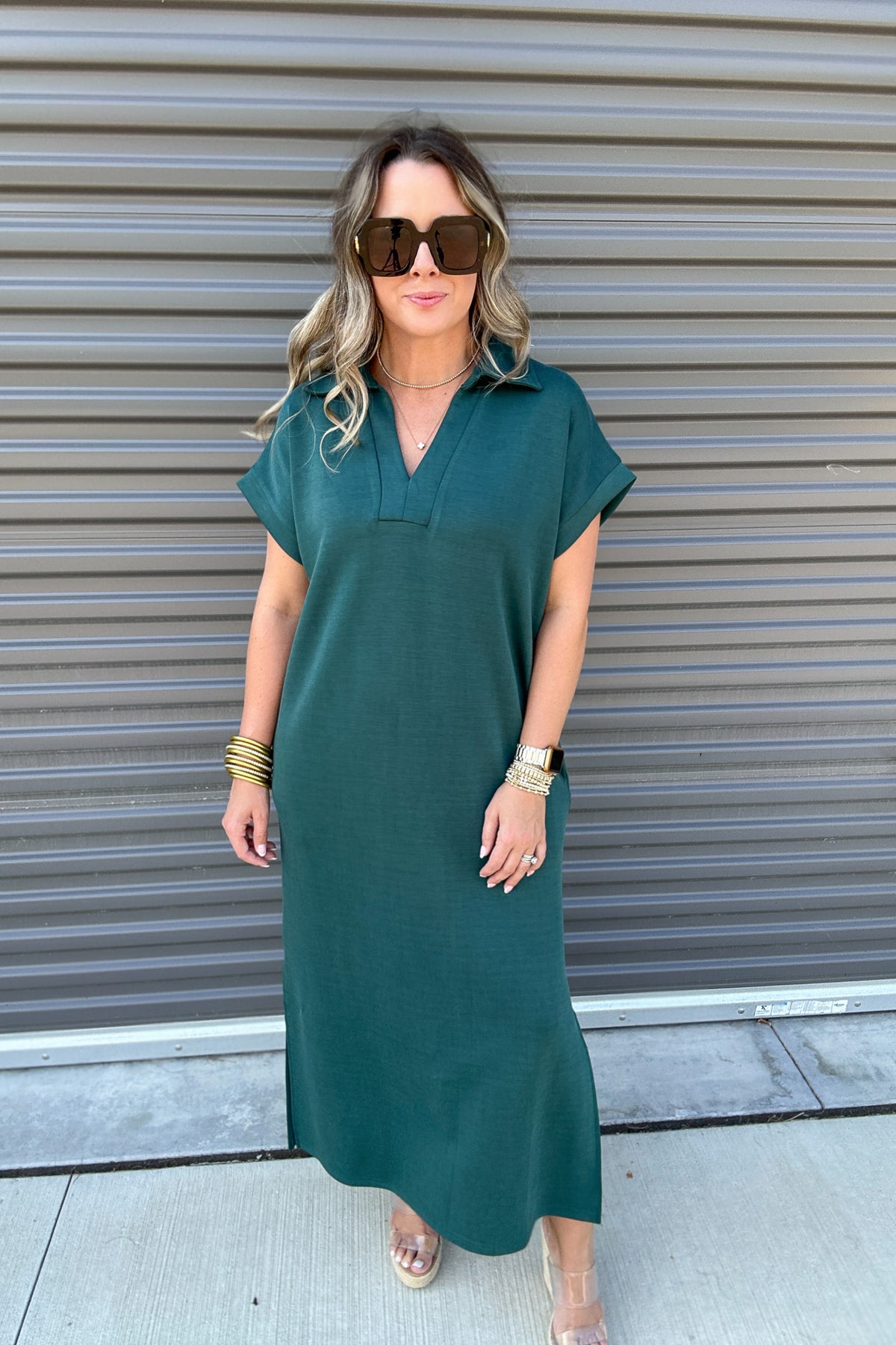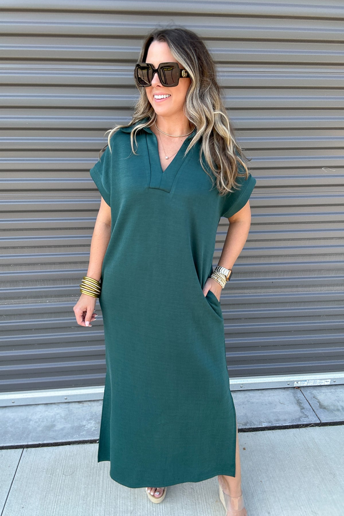 Slip into the Soft and Smooth Maxi Dress in vibrant emerald, crafted from super soft, scuba-like fabric for a cozy yet polished feel. Pockets add a practical touch, while side slits give you easy movement and a playful breeze. Cinch it with the included belt to show off your shape or wear it flowy for a relaxed vibe that's perfect for any occasion.
