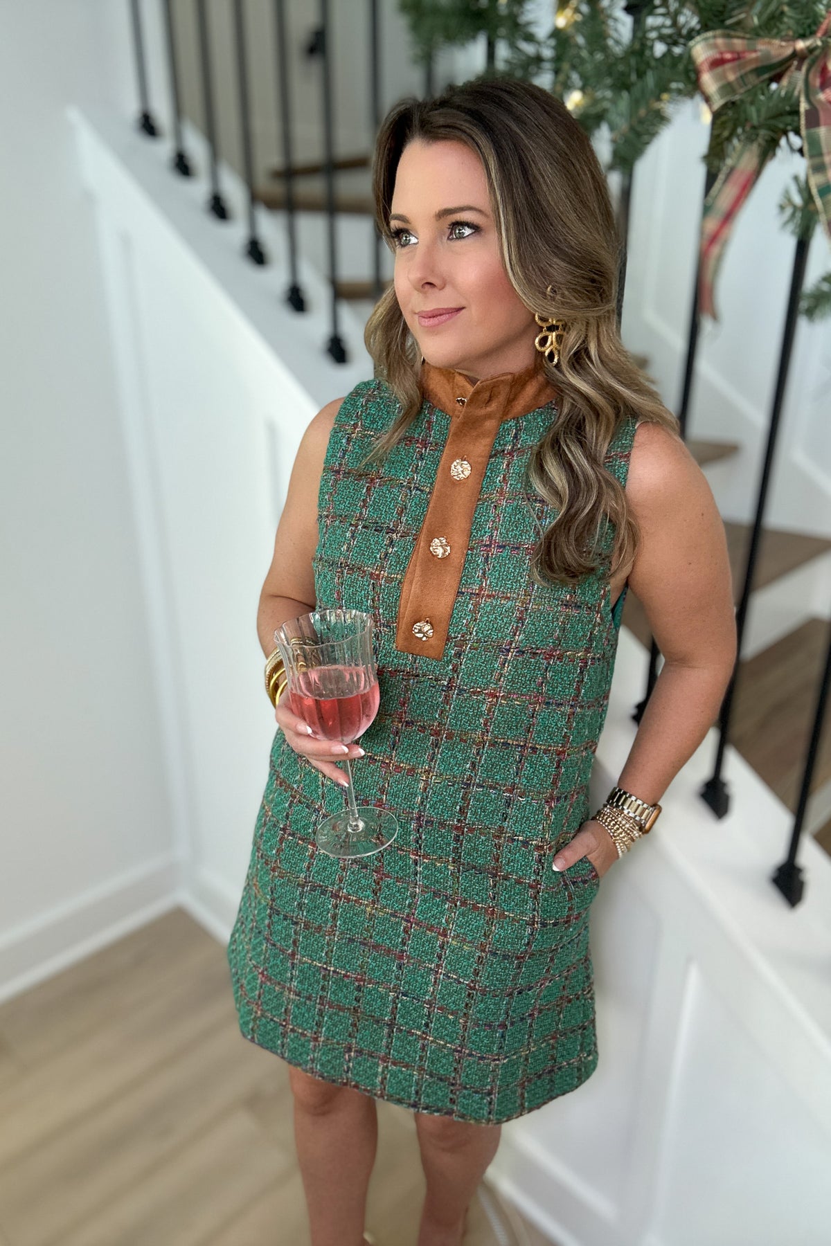 Elevate your wardrobe with this chic green plaid tweed dress that's anything but boring. The sleeveless silhouette pairs perfectly with layering pieces, while gold buttons add a touch of sophistication down the front. Luxe suede detailing frames the neckline for that extra wow factor, and practical pockets keep you looking polished without sacrificing function. Fully lined for comfort and confidence all day long.