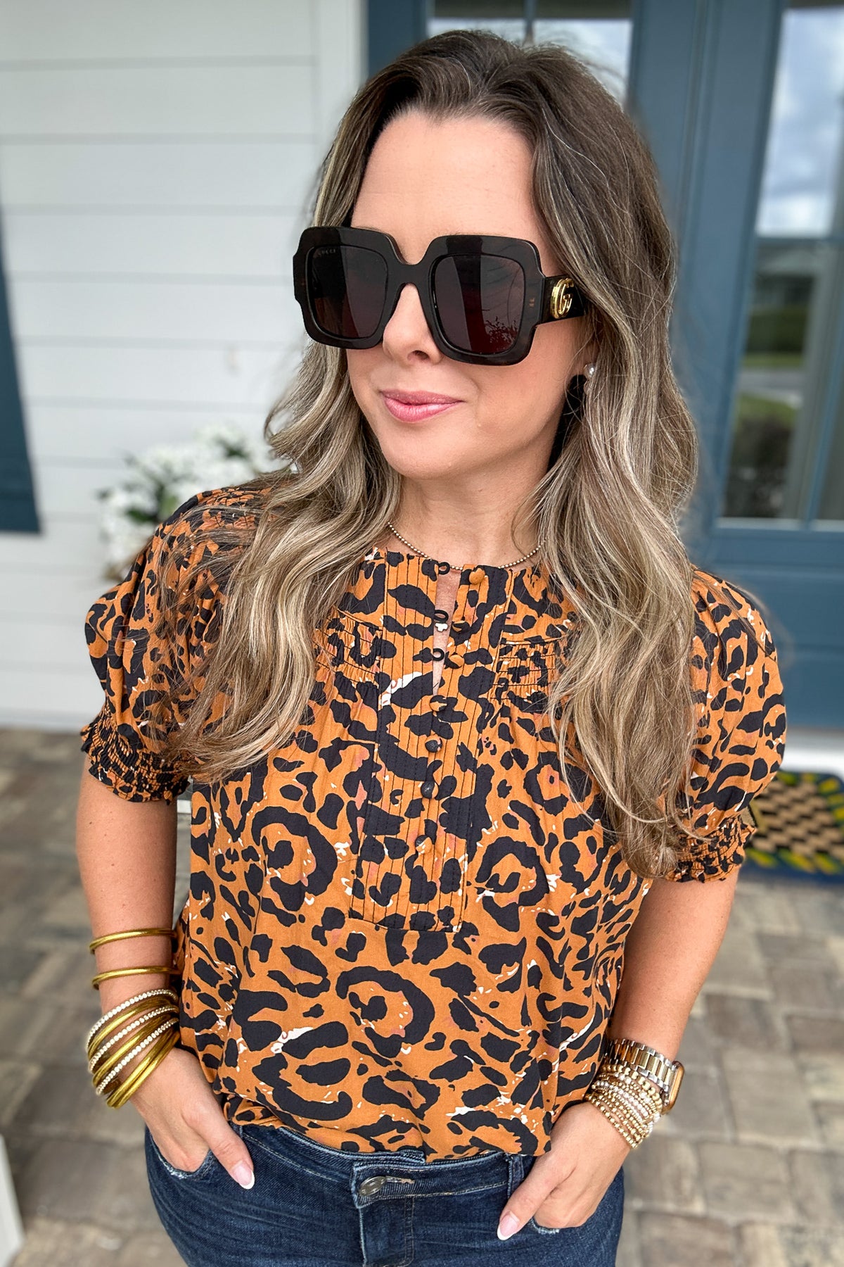 Fierce meets feminine in our Untamed Charm Top! With rich caramel and black leopard print and dainty pleated detailing, slight button front, this one’s perfect for girls’ night or work-to-weekend wear. It’s the ultimate “throw on and look fabulous” blouse.