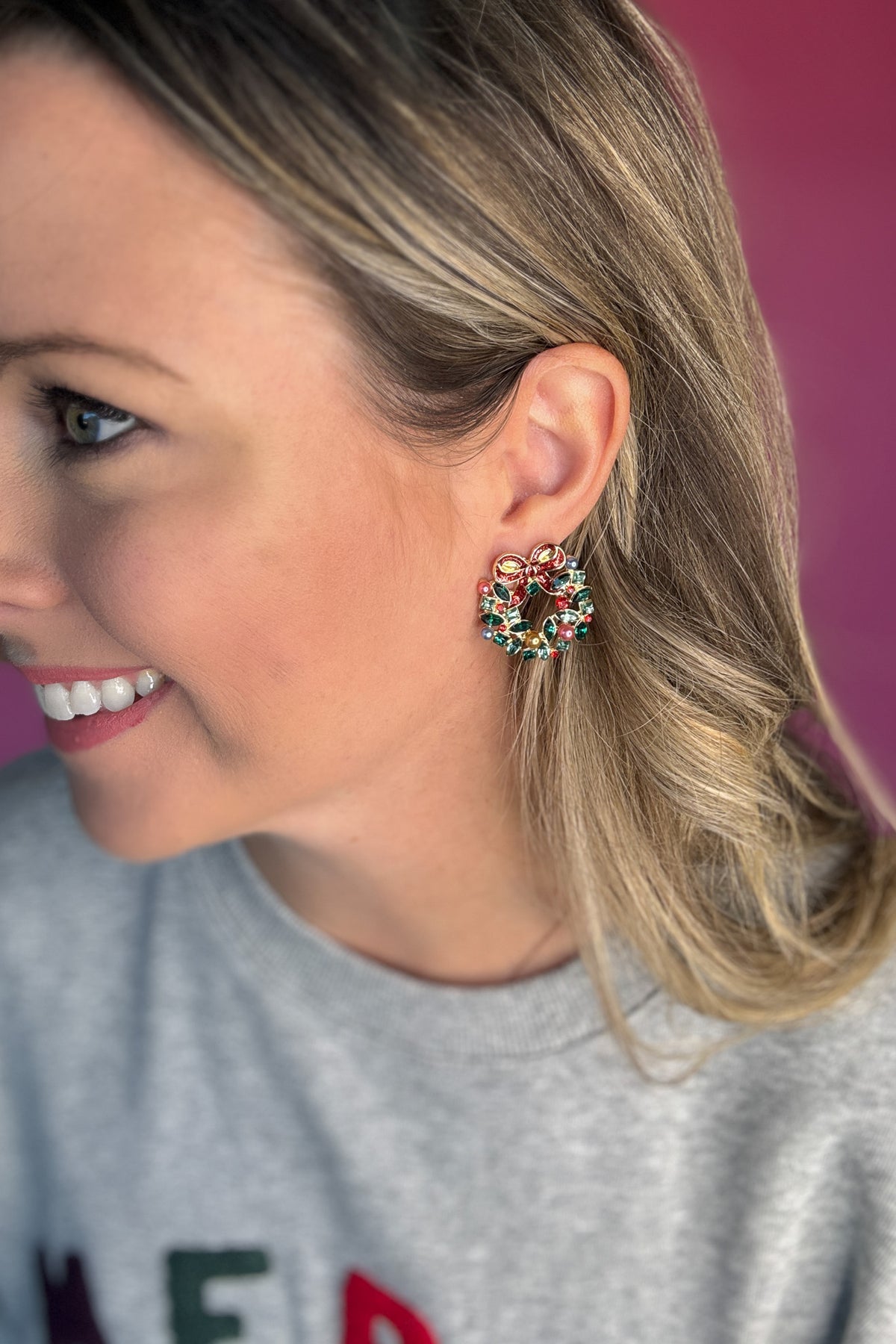 Deck your ears with festive sparkle! These charming wreath stud earrings feature shimmering rhinestones arranged in a classic holiday wreath design. Perfect for adding a touch of seasonal glamour to any outfit, whether you're heading to a party or just spreading holiday cheer. Lightweight and comfortable for all-day wear, these studs are your go-to accessory for making a merry statement.