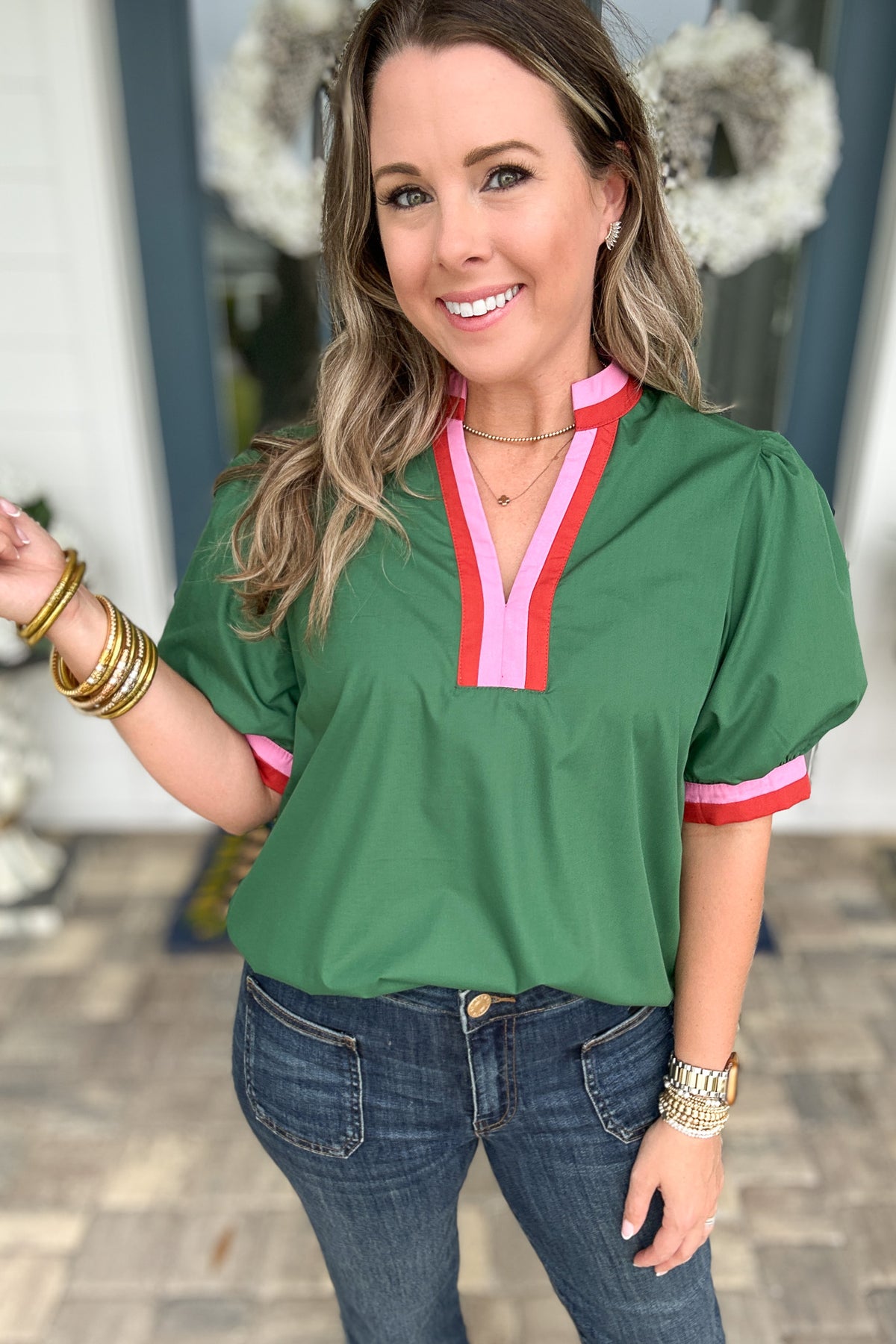 Feel like a "Cart Path Cutie" in this green top! With solid short bubble sleeves and a multicolor band finish. We love this top with a front tuck!