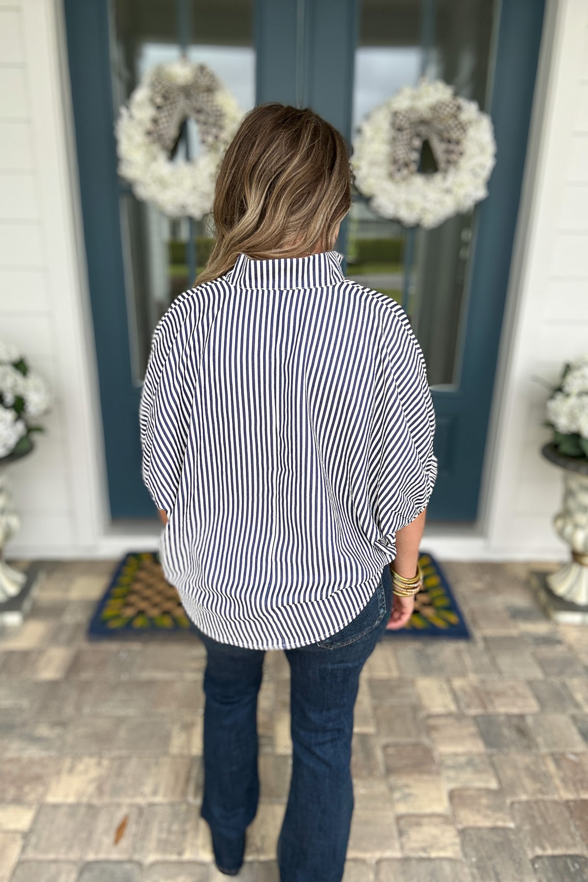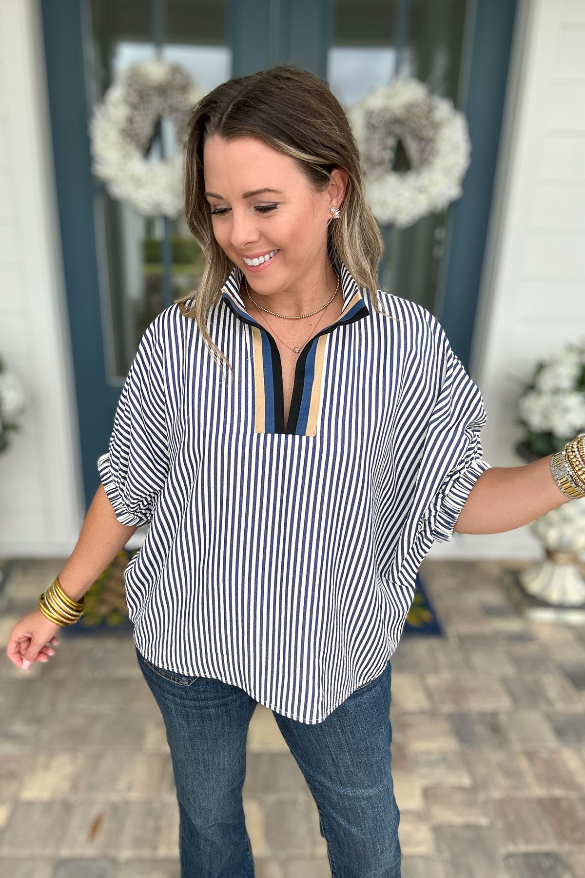 Step into style with the Fall For Stripes Top in navy! This playful dolman top features a striking stripe pattern and a high neckline that adds a chic edge. The elasticated sleeve bands ensure a comfy fit, while the multicolor ribbed band and split neck detail bring a fun pop of color and flair to your look. Perfect for mixing and matching, this top effortlessly balances boldness with comfort.