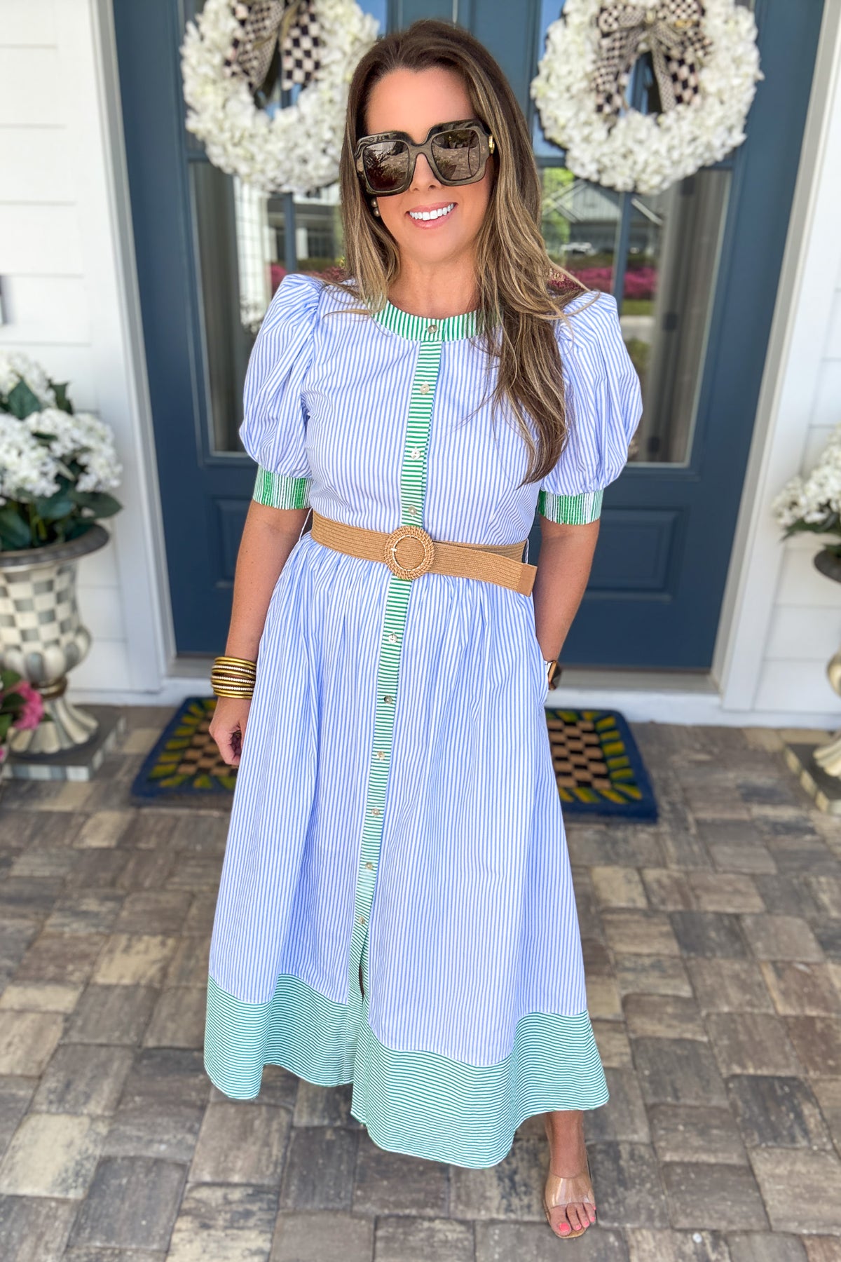 Our Seaside Stripe Button Front Maxi Dress is effortlessly polished with its crisp blue-and-white stripes and playful green contrast trim. The puff sleeves add just the right amount of volume, while the button-front detail and adjustable belt option give you that flattering, pulled-together look. Bonus: it has pockets (because obviously we needed that )