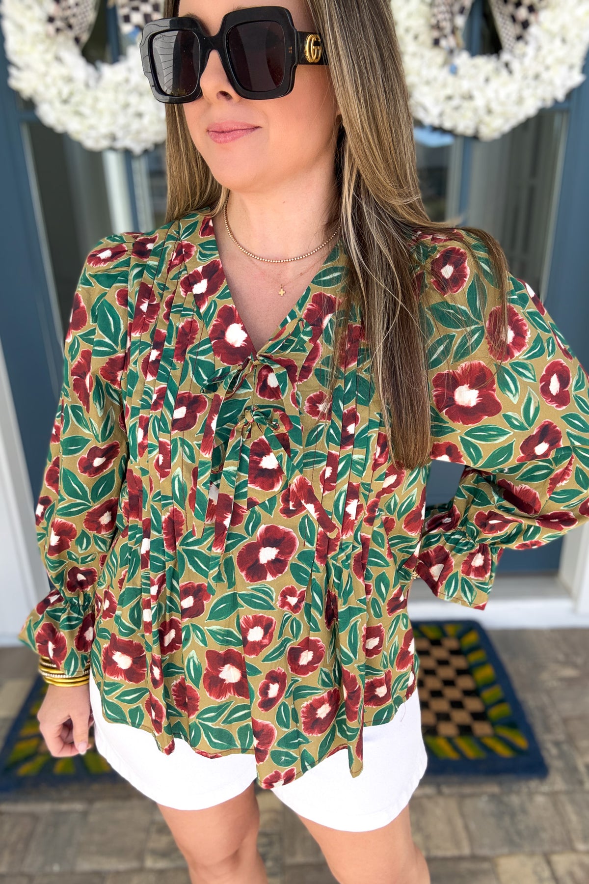 Meet your new go-to spring statement piece. The Fairway Bloom Bow Tie Blouse features a rich green base with bold floral detailing that feels fresh, elevated, and perfectly on trend for the season. Designed in 100% cotton, it’s breathable, lightweight, and easy to wear from morning errands to evening plans.