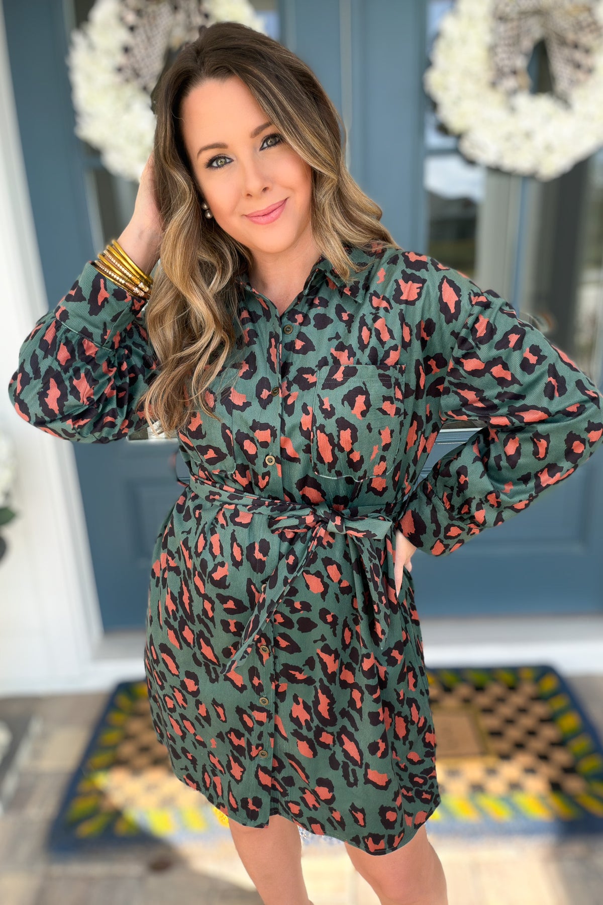 Game day meets everyday chic in this standout corduroy shirt dress. Featuring a rich teal base with bold animal print, this long-sleeve dress is designed with a button-front closure, classic collar, and a flattering self-tie waist. Soft corduroy texture gives it a cozy feel while keeping the look elevated and fun.