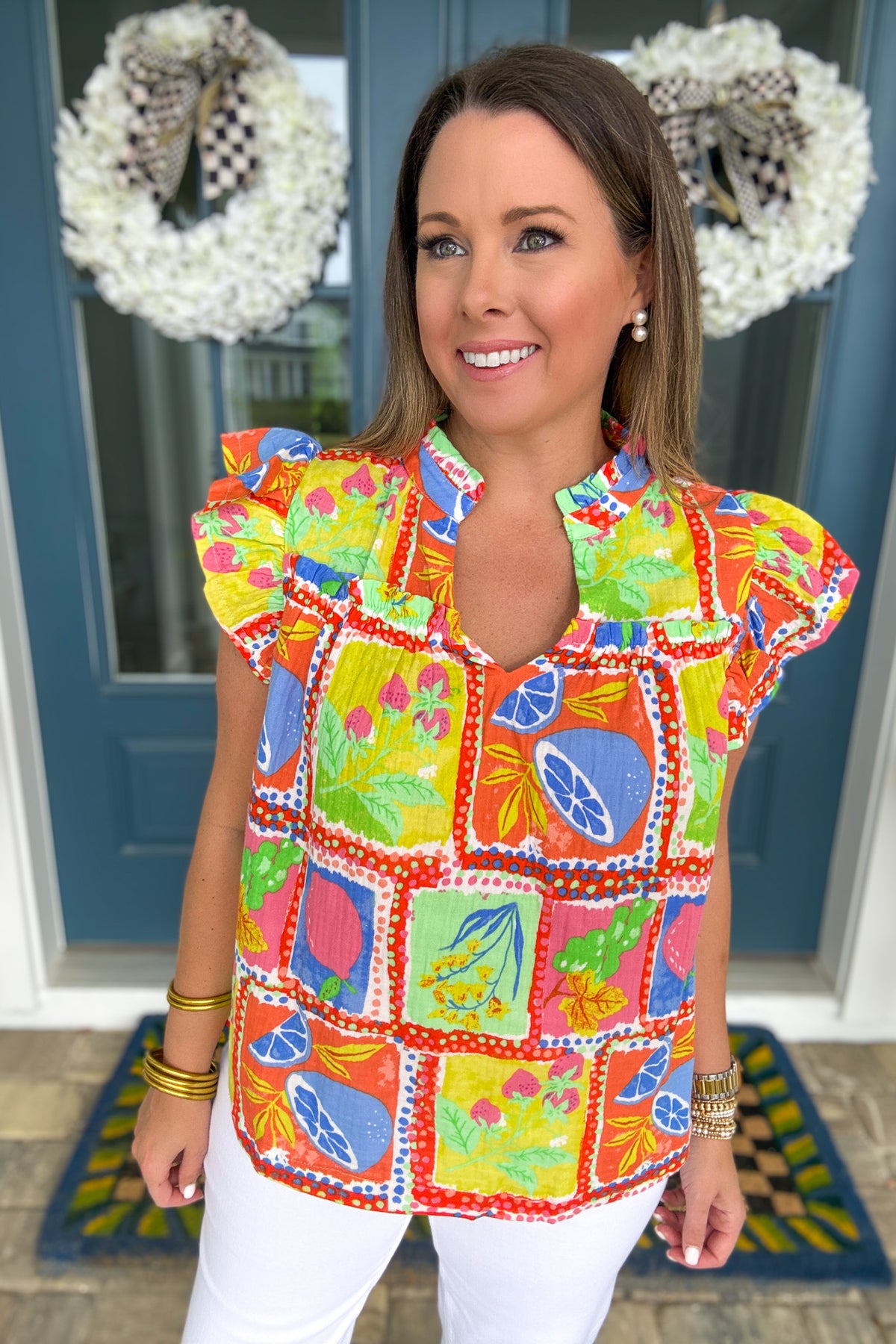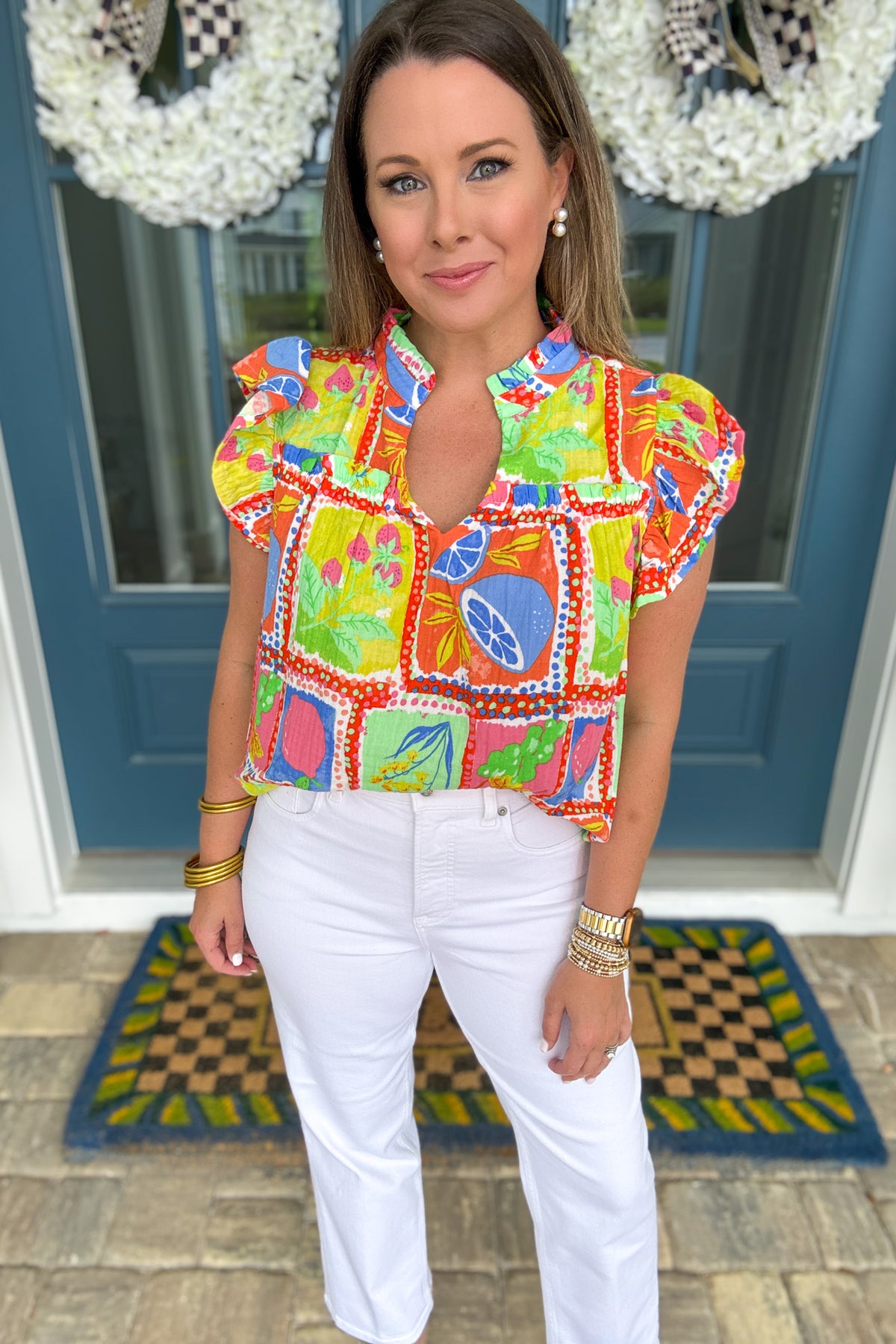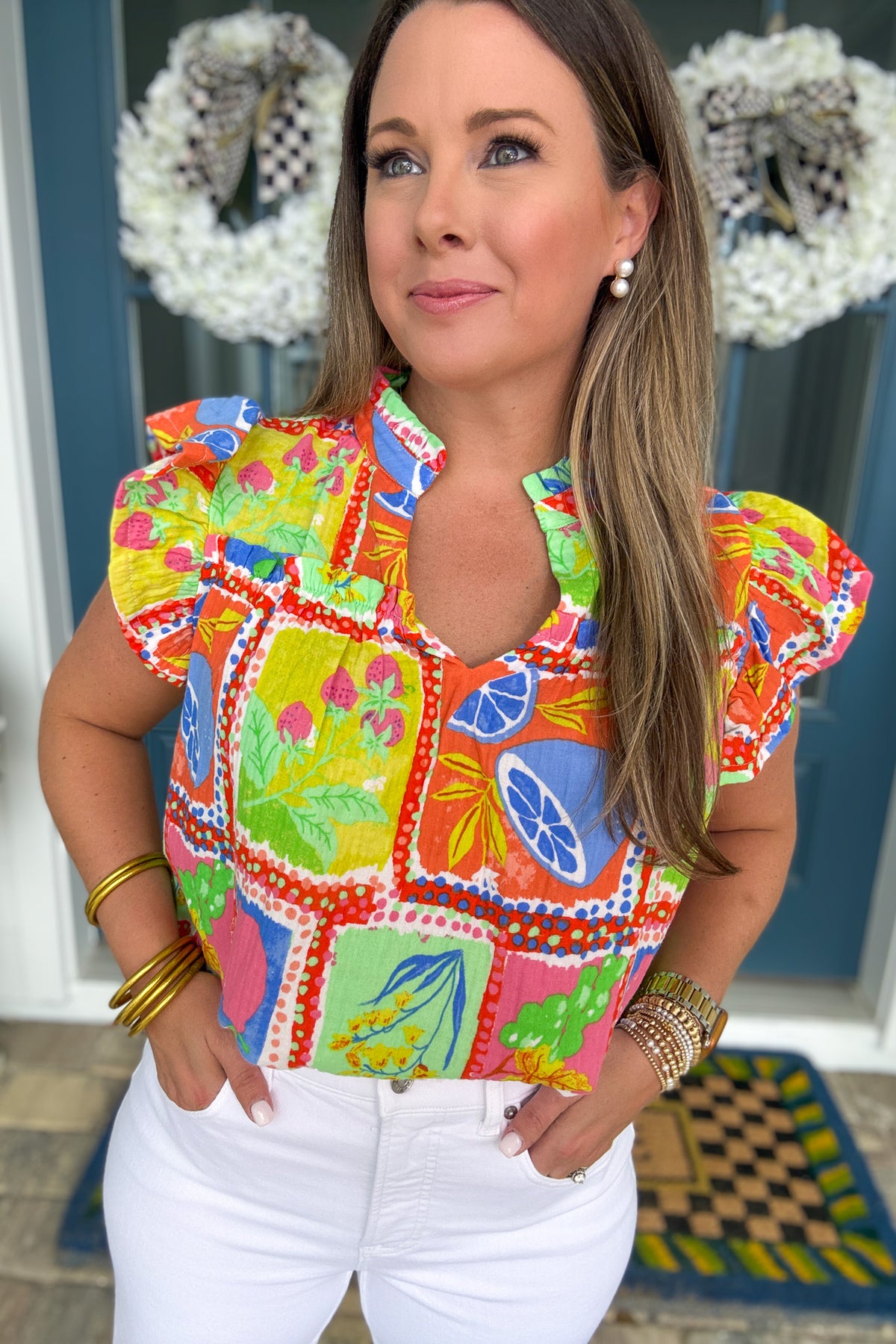Fresh, playful, and full of color—the Karlie Fruit Gauze V-Neck Top is basically summer in clothing form. With its vibrant fruit patchwork print and breezy gauze fabric, this top brings instant joy to your outfit. The ruffle sleeves and flattering v-neckline add just the right amount of feminine detail while keeping it easy and effortless for everyday wear.