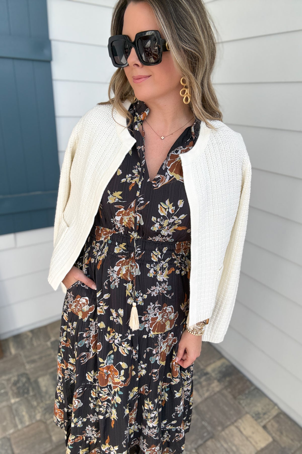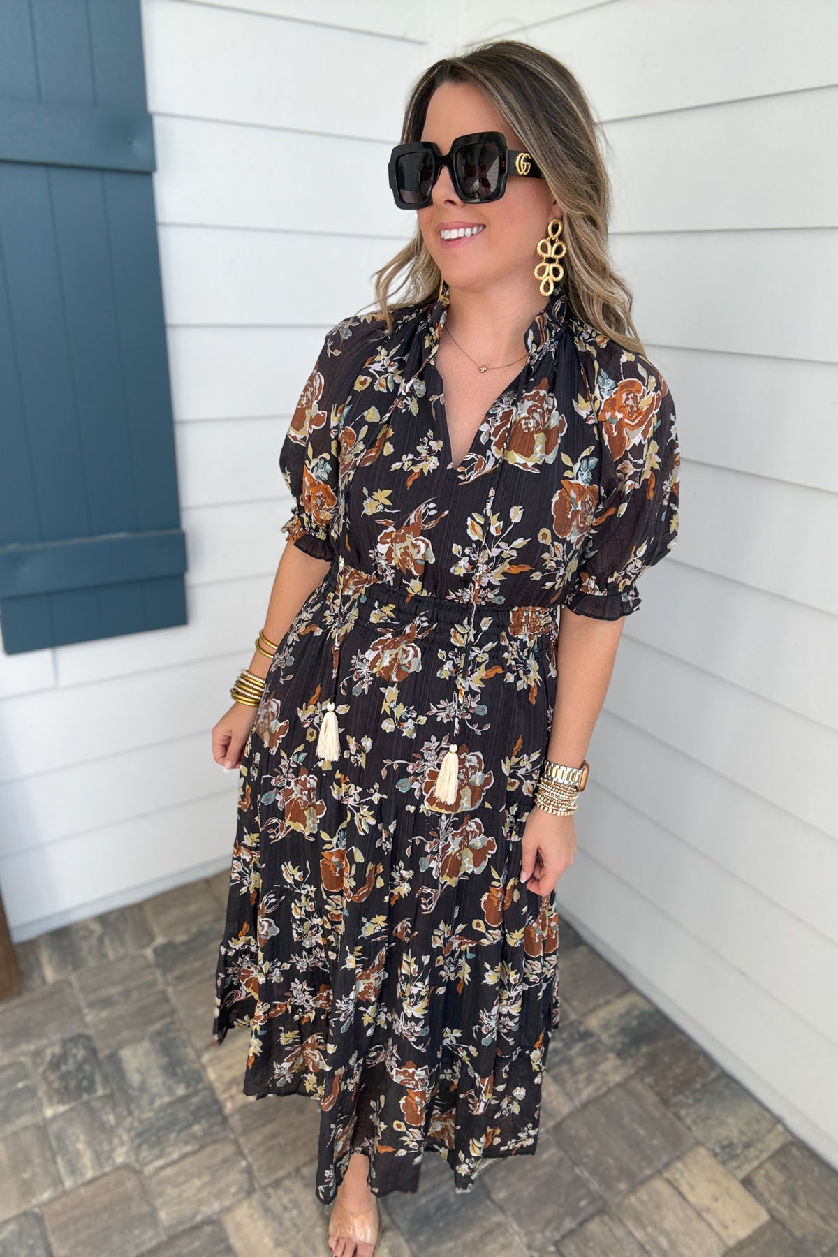 Slip into dreamy comfort with this stunning maxi dress featuring a mesmerizing black and brown floral print. Designed with practical pockets, an elastic waist for easy movement, and charming cuffed short sleeves, this piece transitions effortlessly from day to night. The optional tie neck with tassel adds a playful touch—wear it loose for a relaxed vibe or cinch it for a defined V-neckline. Fully lined for a polished finish, this dress is your new go-to for laid-back elegance.