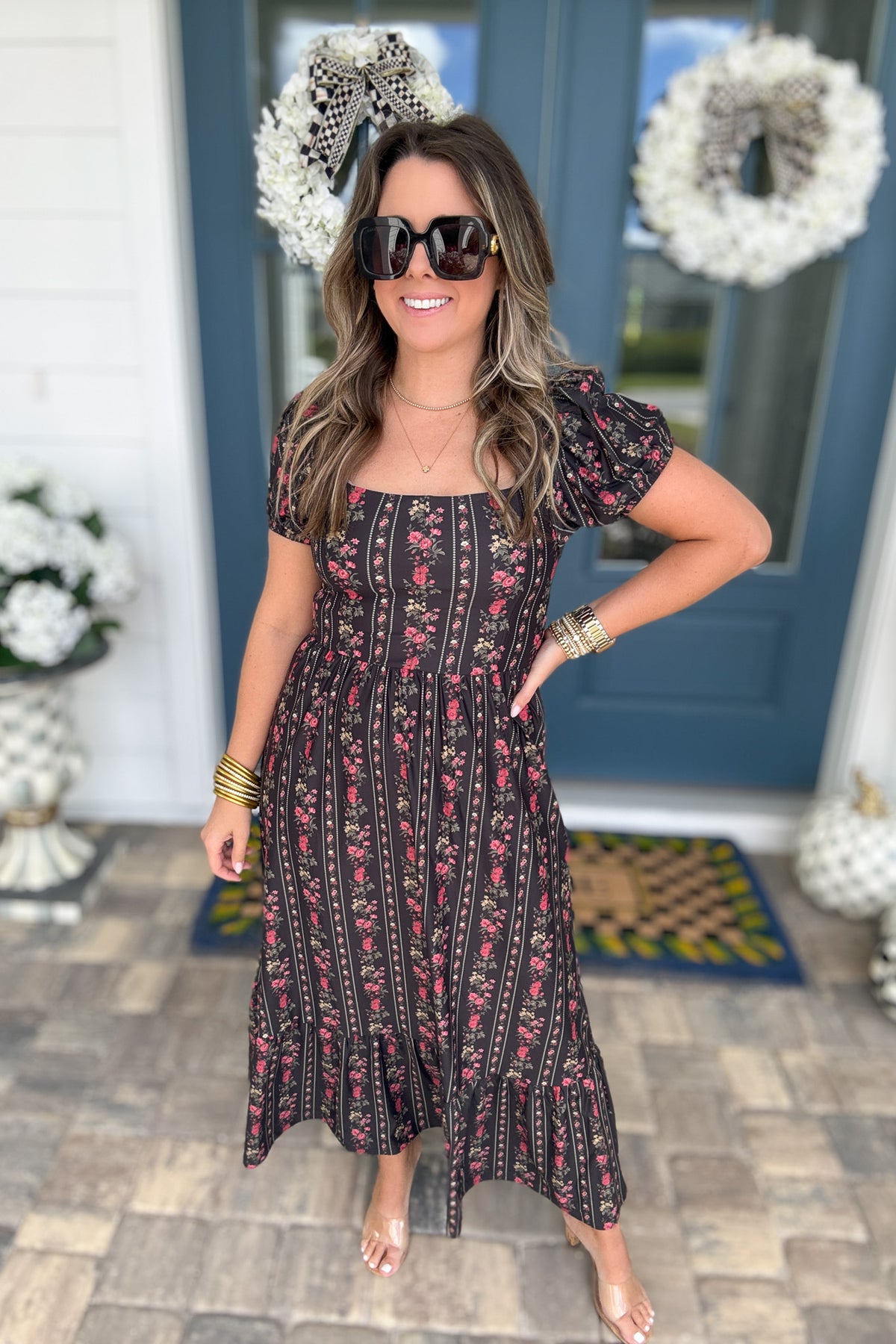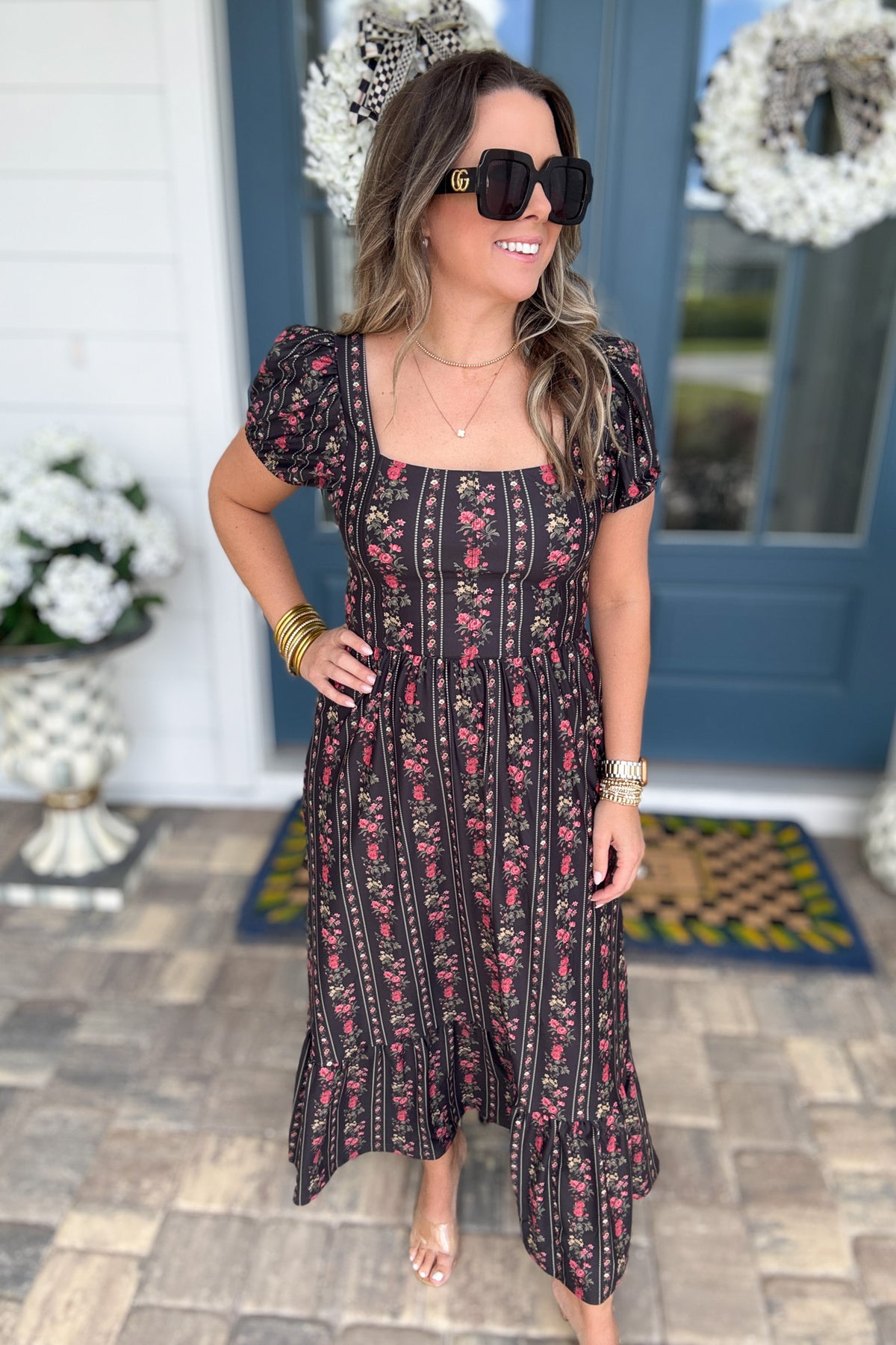 Think of it as everyday Bridgerton wear. You'll love the faux boning on the bodice for a figure-flatting shape with a gorgeous bottom tier. Oversized puff sleeves make this romantic midi a favorite.