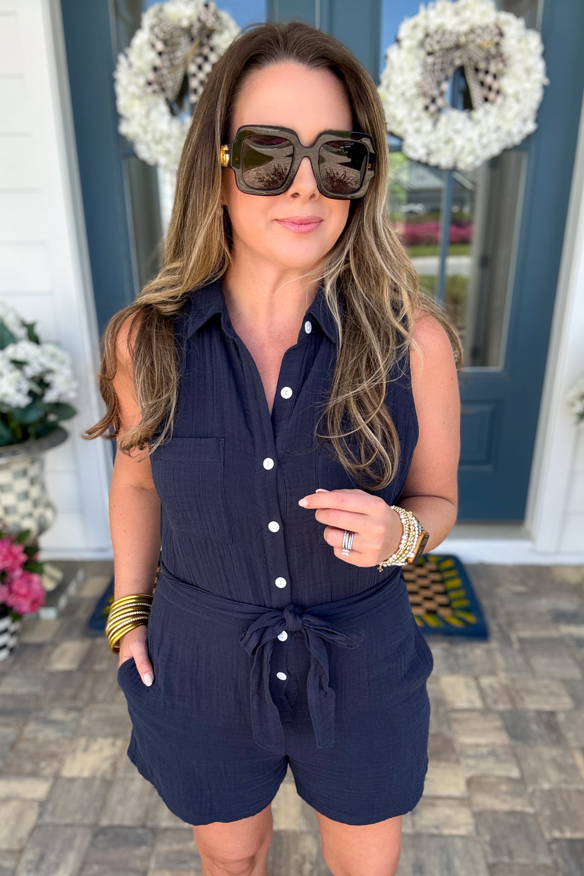 One and done at its finest, this 100% cotton romper is sure to be a go-to look. Its button front makes getting dressed a breeze while its lightweight feel allows for all-day comfort. Side pockets, a tie belt, and collar keep you looking put-together.
