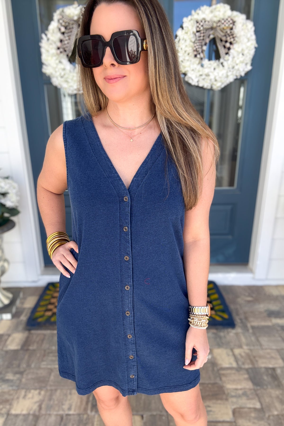Made of 100% cotton, the signature knit jersey fabric brings all the comfort to this denim mini dress. Its v- neck button front and lightweight touch make the dress an easy choice for everyday wear.