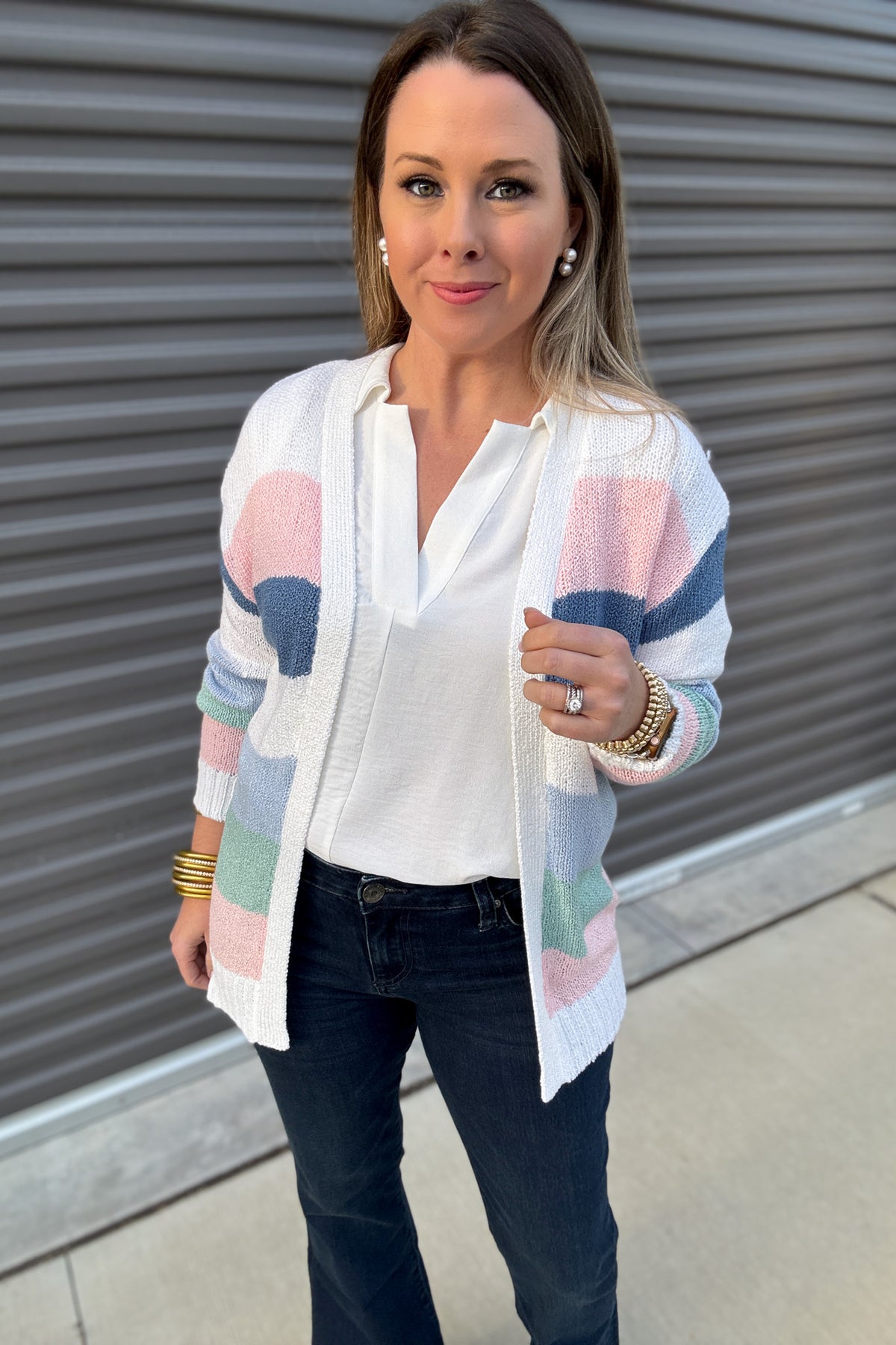 Layer up in effortless style with the Nantucket Cardigan Multi from Simply Southern. This lightweight striped cardigan is your new go-to for breezy days and casual vibes. Perfect for throwing over your favorite tee or dress, it adds just the right amount of warmth without the bulk. The playful multi-stripe pattern keeps things fun and fresh, while the relaxed fit ensures all-day comfort. Whether you're heading to brunch or running errands, this cardigan is the ultimate wardrobe essential that works with everything.