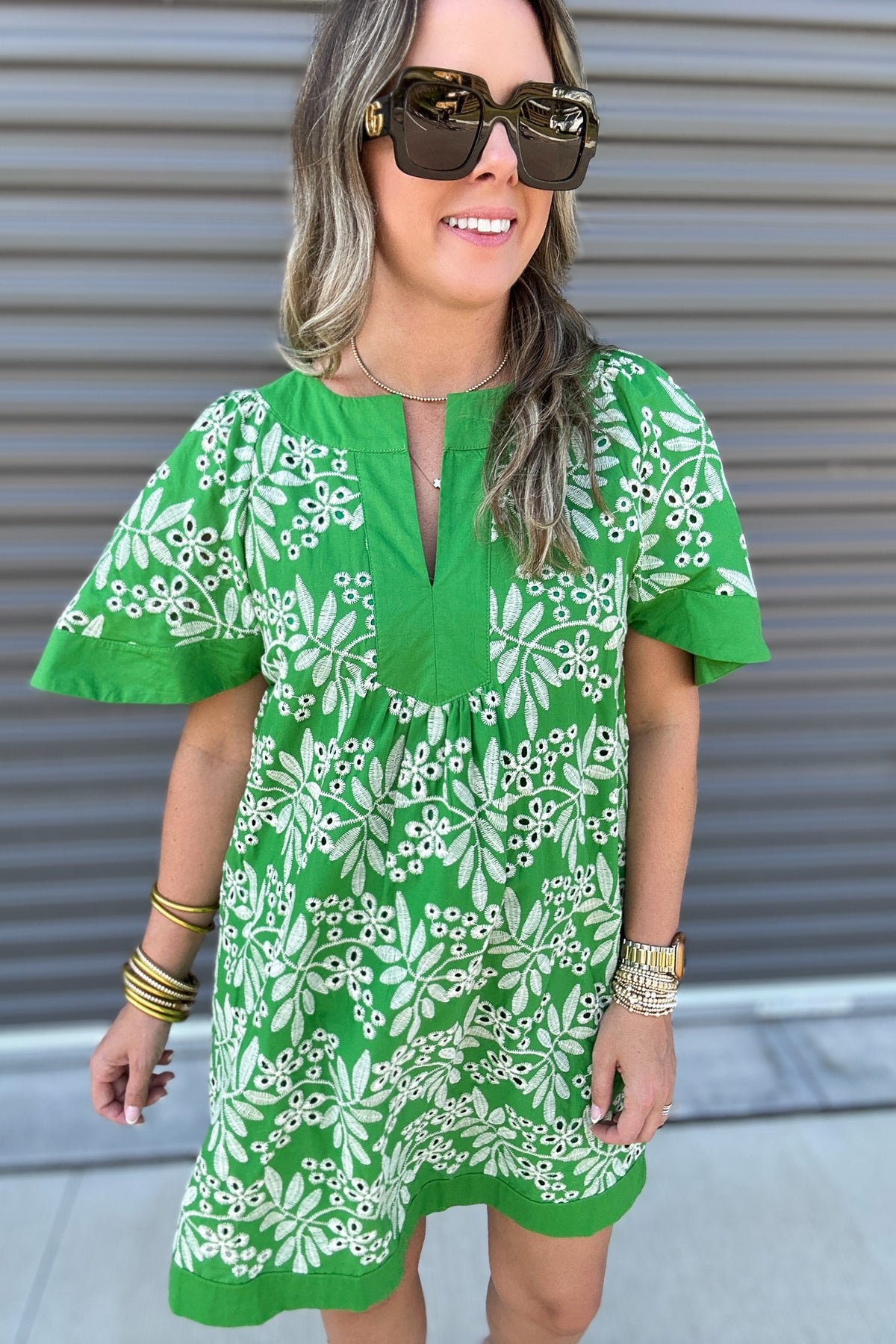 Stand out in vibrant green with our Palm Breeze Embroidered Dress. This breezy mini dress is adorned with white embroidered florals and leaf patterns for a fresh vibe. With its flutter sleeves, notch neckline, and relaxed fit, it’s the ultimate everyday dress.