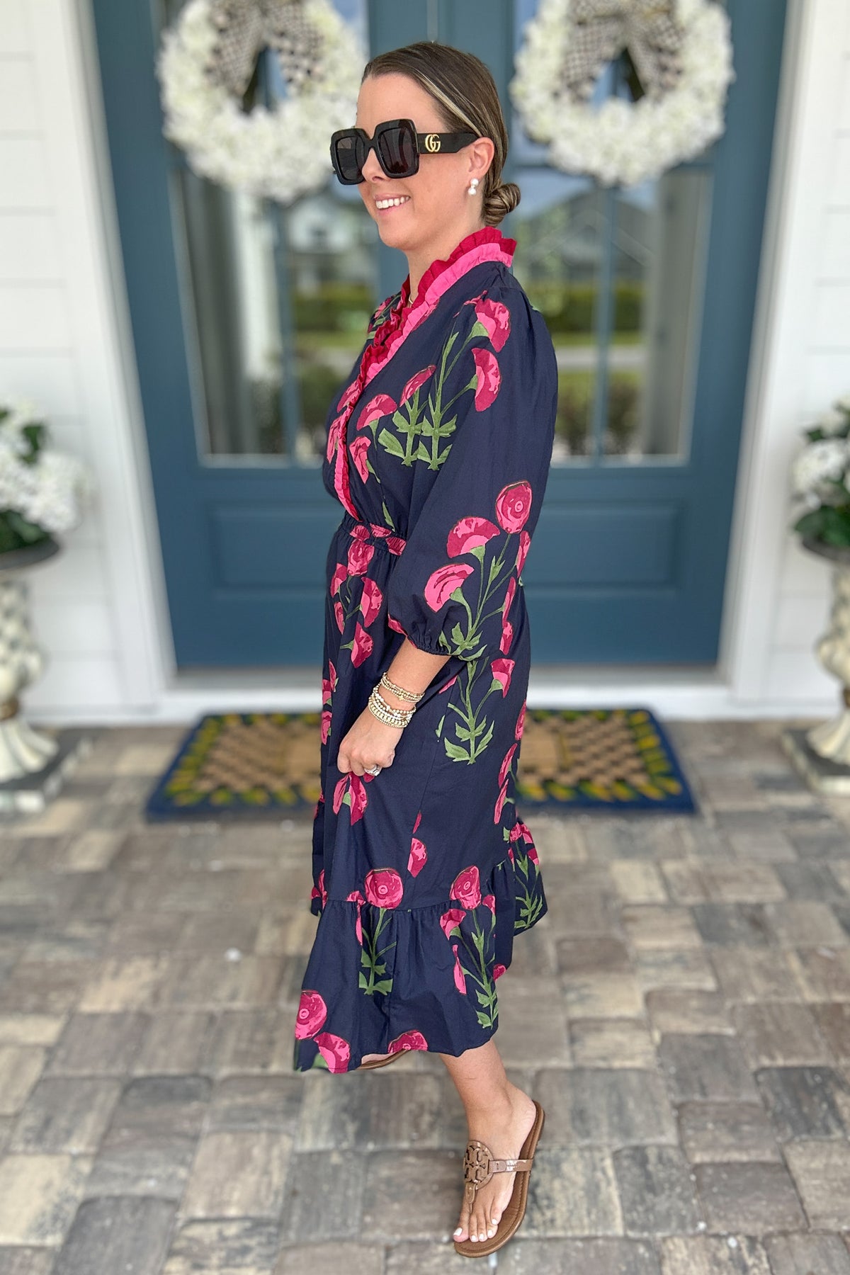 Step into effortless elegance with our Ruffle Bloom Midi Dress. Featuring a navy base adorned with bold pink floral prints, this statement piece is perfect for brunch, vacations, or a chic night out. The relaxed fit, elastic waist, and tiered skirt create a flattering silhouette while the contrasting pink ruffle trim adds a playful pop of detail. Style it with your favorite sandals or dress it up with wedges for a versatile look that transitions seamlessly from day to evening.