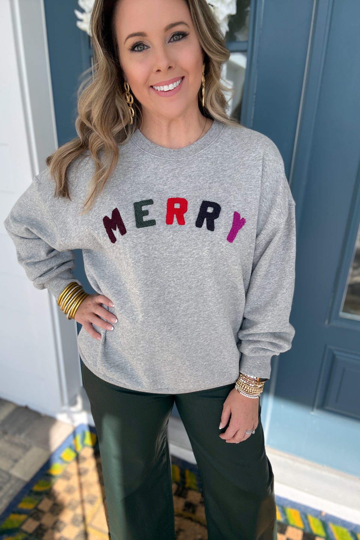 Cozy brushed fleece meets holiday cheer in this oversized pullover. Finished with a multicolor boucle “Merry” graphic, it’s the perfect piece to brighten up slow mornings or seasonal get-togethers.